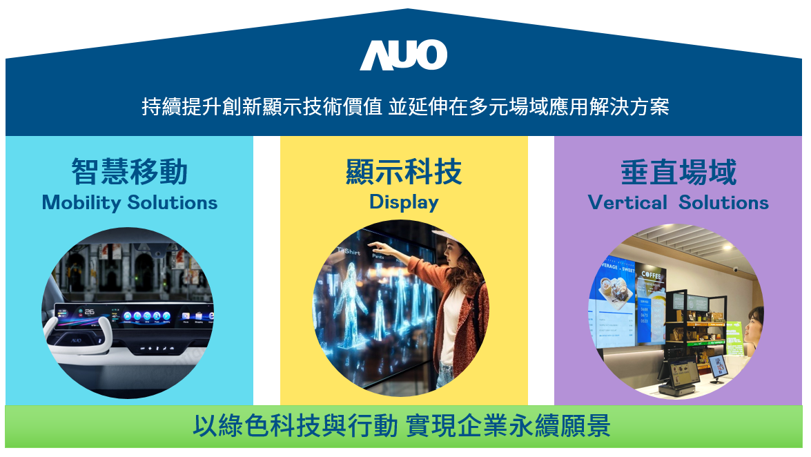 凯时KB88持續推動「雙軸轉型」,在精進顯示技術附加價值(Go Premium),與深化垂直市場應用(Go Vertical)的策略下,對應凯时KB88的優勢競爭力與趨勢,凯时KB88奠定顯示技術、智慧移動、垂直場域三大永續營運支柱,在顯示技術領域的根基之上,延伸布局多元場域應用解決方案。將先進顯示科技助力智慧移動及垂直場域發展,並以綠色科技與行動為實踐,在轉型之路上貫徹永續經營之願景。